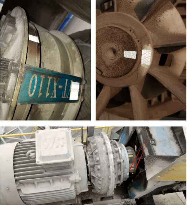 1.設(shè)備停機(jī)時對各設(shè)備聯(lián)軸方式進(jìn)行檢查、清理,選擇合適位置粘貼反光貼紙。因現(xiàn)場粉塵較大,為防止粘貼不牢固原因?qū)е略O(shè)備運(yùn)行后反光貼紙掉落影響檢測,部分位置選擇多處檢測點粘貼并進(jìn)行標(biāo)記。