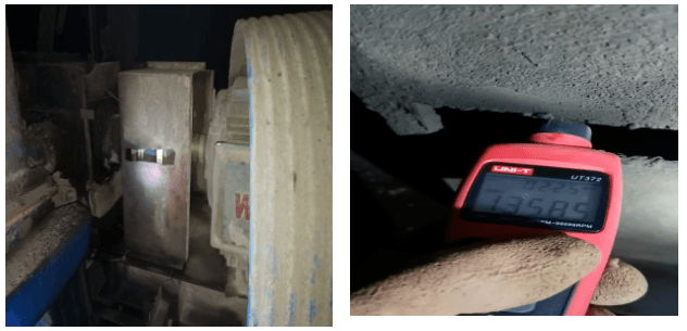 2.設(shè)備運(yùn)行后,使用激光測速儀照射反光貼紙,分別測試并記錄各設(shè)備主、從動軸運(yùn)行轉(zhuǎn)速。
