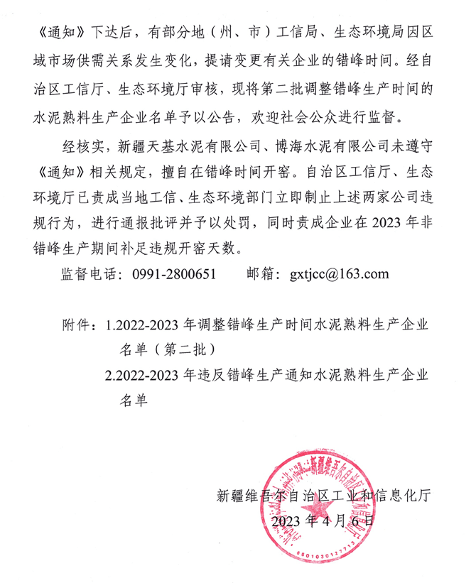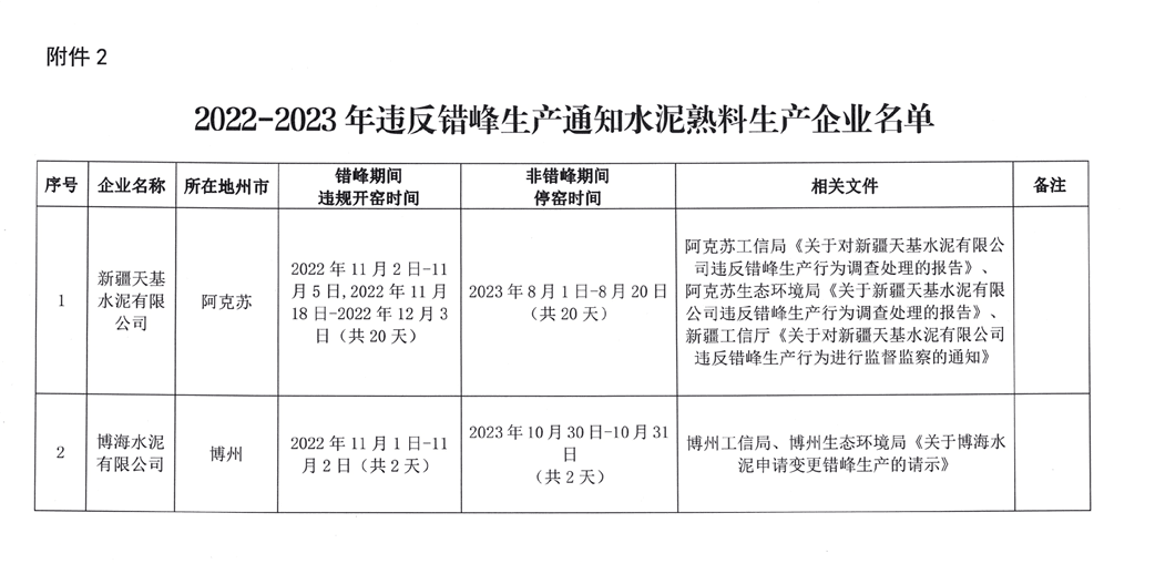 日前,新疆維吾爾自治區(qū)工信廳發(fā)布公告文件公開(kāi)通報(bào)新疆天基水泥有限公司、博海水泥有限公司未遵守《通知》相關(guān)規(guī)定,擅自在錯(cuò)峰時(shí)間開(kāi)窯。自治區(qū)工信廳、生態(tài)環(huán)境廳已責(zé)成當(dāng)?shù)毓ば?、生態(tài)環(huán)境部門立即制止上述兩家公司違規(guī)行為,進(jìn)行通報(bào)批評(píng)并予以處罰,同時(shí)責(zé)成企業(yè)在 2023 年非錯(cuò)峰生產(chǎn)期間補(bǔ)足違規(guī)開(kāi)窯天數(shù)。