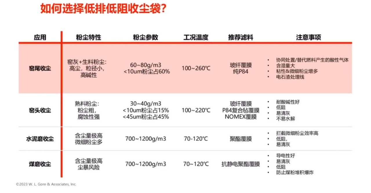 選擇低排低阻收塵濾袋首先需要考慮工藝點(diǎn)粉塵的特性,含塵量,粉塵粒徑,工況溫度(極限溫度和持續(xù)工作溫度)。再根據(jù)工藝特點(diǎn)有針對(duì)性地選擇,如是否有協(xié)同處置?是否使用替代燃料,是否添加鋼渣,電石渣、化工廢渣等?以判斷粉塵中的油氣、黏性是否會(huì)引起煙氣的酸堿度、濕度的變化。另外,窯頭、窯尾、水泥磨、煤磨各點(diǎn)位因粉塵的特性的不同對(duì)上述參數(shù)的要求各有不同。