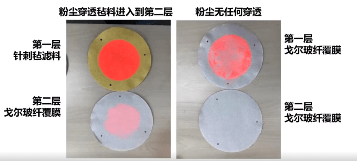 用兩層面料做測(cè)試,如果第一層性能好的話,第二層上就看不到粉塵的泄漏。從對(duì)比效果可見,兩層都采用戈?duì)柌@w覆膜濾料,第一層濾料攔截粉塵之后,光滑表示不容易掛灰,起到了有效清灰的效果。