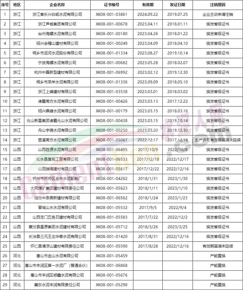 據(jù)查詢,近期浙江、河南、山西三省市場(chǎng)監(jiān)管部門(mén)發(fā)布了注銷水泥企業(yè)生產(chǎn)許可通告,近30家企業(yè)生產(chǎn)許可證被注銷。