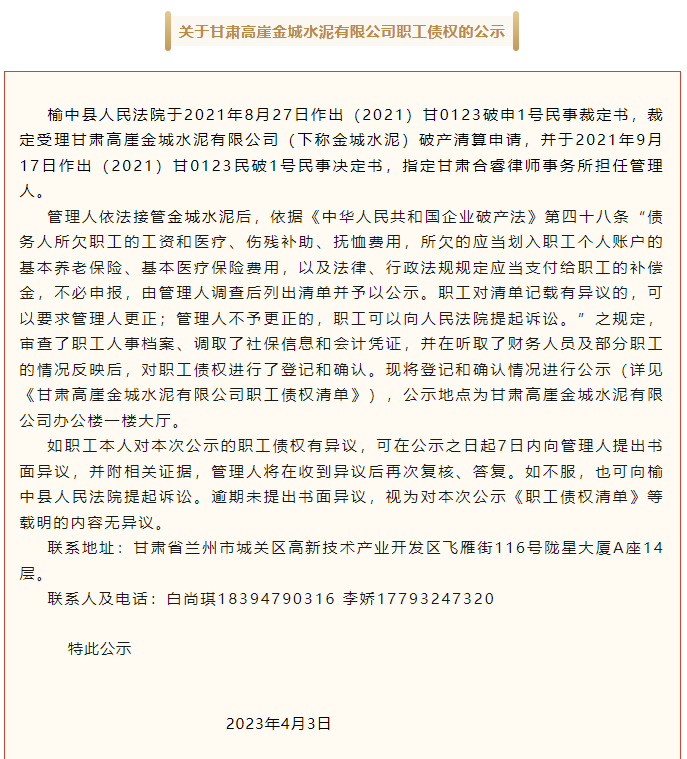 據(jù)水泥人網(wǎng)了解,4月3日,甘肅省蘭州市榆中縣人民法院發(fā)布關(guān)于甘肅高崖金城水泥有限公司職工債權(quán)的公示稱,已于2021年8月27日作出民事裁定書,裁定受理甘肅高崖金城水泥有限公司破產(chǎn)清算申請(qǐng),并于2021年9月17日指定甘肅合睿律師事務(wù)所擔(dān)任管理人。
