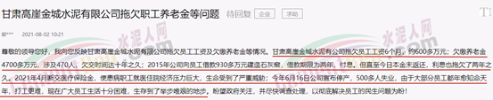 據(jù)水泥人網(wǎng)此前消息,早在2021年就有員工在“領(lǐng)導(dǎo)留言板”留言反映,甘肅高崖金城水泥有限公司拖欠員工工資6個(gè)月,約600多萬(wàn)元,欠繳養(yǎng)老金4700多萬(wàn)元,涉及470人,欠繳時(shí)間達(dá)十年之久。(相關(guān)鏈接:憤怒!涉及470人!又一水泥廠欠薪!)