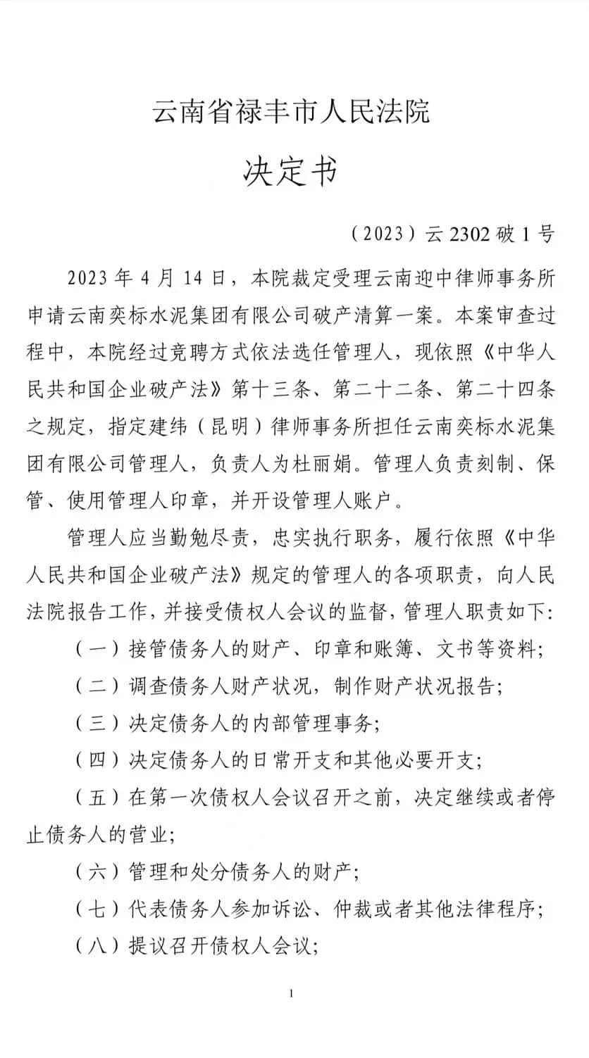 2023年4月14日,云南省祿豐市人民法院裁定受理云南迎中律師事務(wù)所申請(qǐng)?jiān)颇限葮?biāo)水泥集團(tuán)有限公司破產(chǎn)清算一案。本案審查過(guò)程中,法院經(jīng)過(guò)競(jìng)聘方式依法選任管理人,并依照《中華人民共和國(guó)企業(yè)破產(chǎn)法》第十三條、第二十二條、第二十四條之規(guī)定,指定建緯(昆明)律師事務(wù)所擔(dān)任云南奕標(biāo)水泥集團(tuán)有限公司管理人。