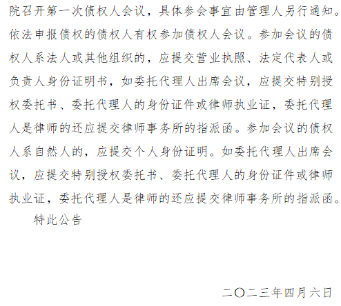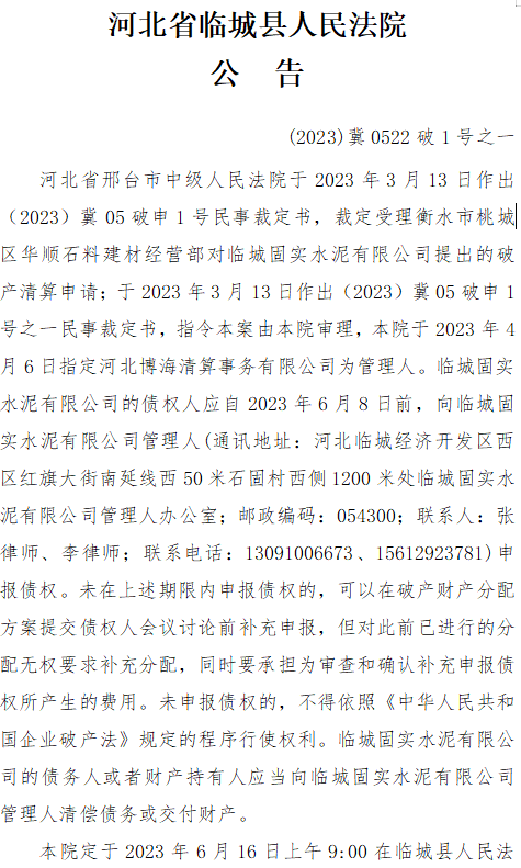 2023年4月6日,河北省臨城縣人民法院公告稱,河北省邢臺(tái)市中級(jí)人民法院于2023年3月13日作出(2023)冀05破申1號(hào)民事裁定書,裁定受理衡水市桃城區(qū)華順石料建材經(jīng)營(yíng)部對(duì)臨城固實(shí)水泥有限公司提出的破產(chǎn)清算申請(qǐng),并于2023年4月6日指定河北博海清算事務(wù)有限公司為管理人。定于2023年6月16日上午9:00在臨城縣人民法院召開第一次債權(quán)人會(huì)議。