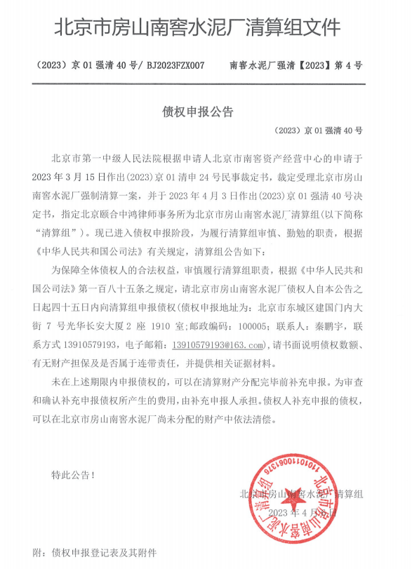 北京市房山南窖水泥廠強(qiáng)制清算已進(jìn)入債權(quán)申報(bào)階段