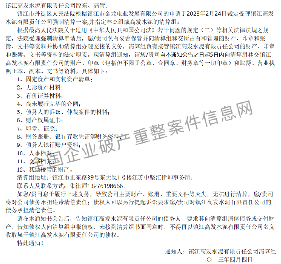 鎮(zhèn)江高發(fā)水泥有限責(zé)任公司被清算組接管