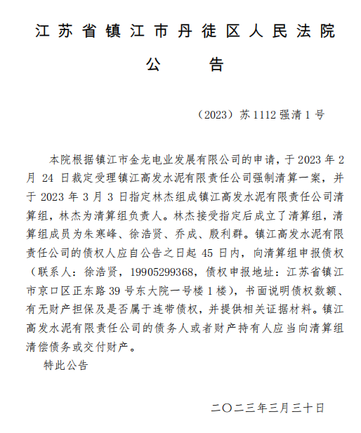 3月30日,江 蘇 省 鎮(zhèn) 江 市 丹 徒 區(qū) 人 民 法 院發(fā)布公告稱,根據(jù)鎮(zhèn)江市金龍電業(yè)發(fā)展有限公司的申請(qǐng),于 2023 年 2月 24 日裁定受理鎮(zhèn)江高發(fā)水泥有限責(zé)任公司強(qiáng)制清算一案,并于 2023 年 3 月 3 日指定林杰組成鎮(zhèn)江高發(fā)水泥有限責(zé)任公司清算組。