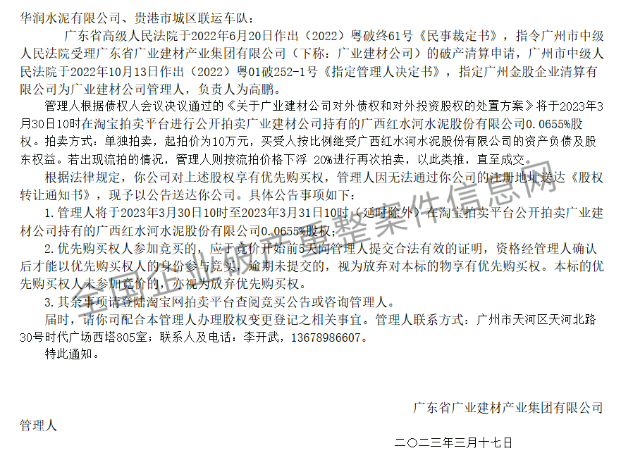 3月17日廣東省廣業(yè)建材產(chǎn)業(yè)集團(tuán)有限公司管理人發(fā)布通知給華潤(rùn)水泥有限公司、貴港市城區(qū)聯(lián)運(yùn)車隊(duì)稱,廣東省高級(jí)人民法院于2022年10月13日指定廣州金股企業(yè)清算有限公司為廣業(yè)建材公司管理人。管理人根據(jù)債權(quán)人會(huì)議決議于2023年3月30日10時(shí)在淘寶拍賣平臺(tái)進(jìn)行公開拍賣廣業(yè)建材公司持有的廣西紅水河水泥股份有限公司0.0655%股權(quán)。