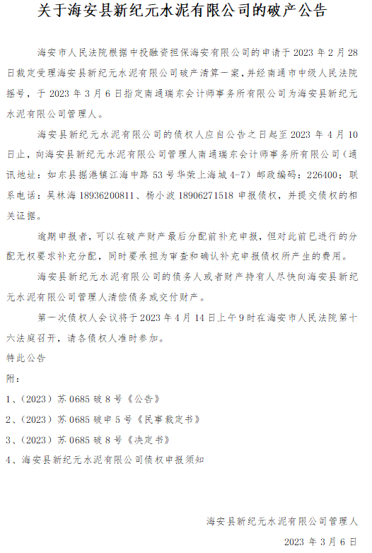 3月6日海安縣新紀(jì)元水泥有限公司管理人發(fā)布公告稱,海安市人民法院根據(jù)中投融資擔(dān)保海安有限公司的申請(qǐng)于2023年2月28日裁定受理海安縣新紀(jì)元水泥有限公司破產(chǎn)清算一案,并指定管理人。