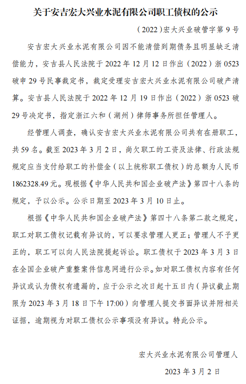 3月2日宏大興業(yè)水泥有限公司管理人發(fā)布職工債權(quán)公示稱,安吉縣人民法院于2022年12月12日裁定受理安吉宏大興業(yè)水泥有限公司破產(chǎn)清算,指定浙江六和(湖州)律師事務(wù)所擔(dān)任管理人。