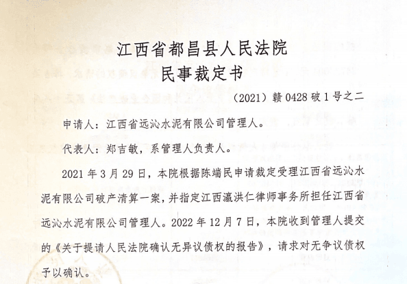2月27日,江西省都昌縣人民法院民事裁定書提到,2021年3月29日,法院根據(jù)陳端民申請(qǐng)裁定受理江西省遠(yuǎn)沁水泥有限公司破產(chǎn)清算一案,并指定江西流洪仁律師事務(wù)所擔(dān)任江西省遠(yuǎn)沁水泥有限公司管理人。2022年12月7日,法院收到管理人提交的《關(guān)于提請(qǐng)人民法院確認(rèn)無(wú)異議債權(quán)的報(bào)告》,請(qǐng)求對(duì)無(wú)爭(zhēng)議債權(quán)予以確認(rèn)。