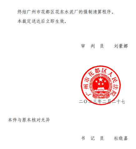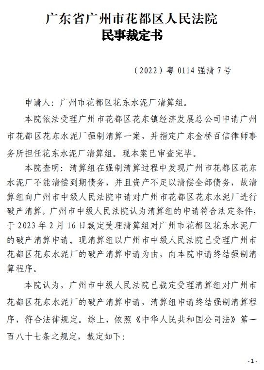 2月27日,廣東省廣州市花都區(qū)人民法院民事裁定書提到,清算組在強(qiáng)制清算過(guò)程中發(fā)現(xiàn)廣州市花都區(qū)花東水泥廠不能清償?shù)狡趥鶆?wù),并且資產(chǎn)不足以清償全部債務(wù),故清算組向廣州市中級(jí)人民法院申請(qǐng)對(duì)廣州市花都區(qū)花東水泥廠進(jìn)行破產(chǎn)清算。廣州市中級(jí)人民法院認(rèn)為清算組的申請(qǐng)符合法定條件,于 2023 年 2 月 16 日裁定受理清算組對(duì)廣州市花都區(qū)花東水泥廠的破產(chǎn)清算申請(qǐng)。清算組以廣州市中級(jí)人民法院已受理廣州市花都區(qū)花東水泥廠的破產(chǎn)清算申請(qǐng)為由,向法院申請(qǐng)終結(jié)強(qiáng)制清算程序。