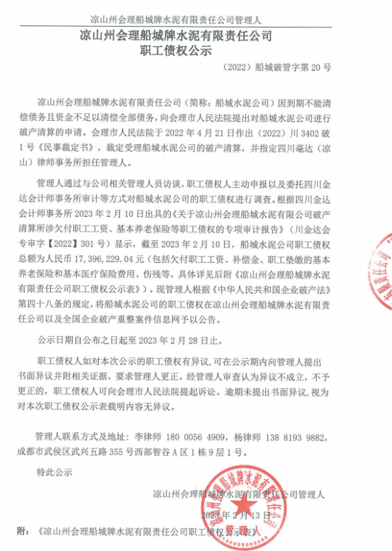 2月13日,涼山州會(huì)理船城牌水泥有限責(zé)任公司管理人發(fā)布職工債權(quán)公示稱,會(huì)理市人民法院于2022年4月21日作出裁定受理船城水泥公司的破產(chǎn)清算,并指定四川毫達(dá)(諒山)律師事務(wù)所擔(dān)任管理人。截至2023年2月10日,船城水泥公司職工債權(quán)總額為人民幣17,396,229.04元(包括欠付職工工資、補(bǔ)償金、職工墊繳的基本養(yǎng)老保險(xiǎn)和基本醫(yī)療保險(xiǎn)費(fèi)用、傷殘等。