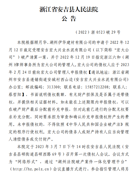 1月9日安吉縣人民法院公告,法院根據(jù)顧月華、湖州伊華建材有限公司的申請(qǐng)于 2022 年 12月 12 日裁定受理安吉宏大興業(yè)水泥有限公司破產(chǎn)清算一案,并于 2022 年 12 月 19 日指定浙江六和(湖州)律師事務(wù)所為宏大公司的管理人。