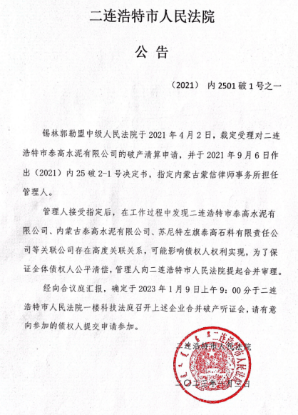 1月3日二連浩特市人民法院發(fā)布公告稱,錫林郭勒盟中級(jí)人民法院于 2021 年4月2日,裁定受理對(duì)二連浩特市泰高水泥有限公司的破產(chǎn)清算申請(qǐng),并指定內(nèi)蒙古蒙信律師事務(wù)所擔(dān)任管理人。