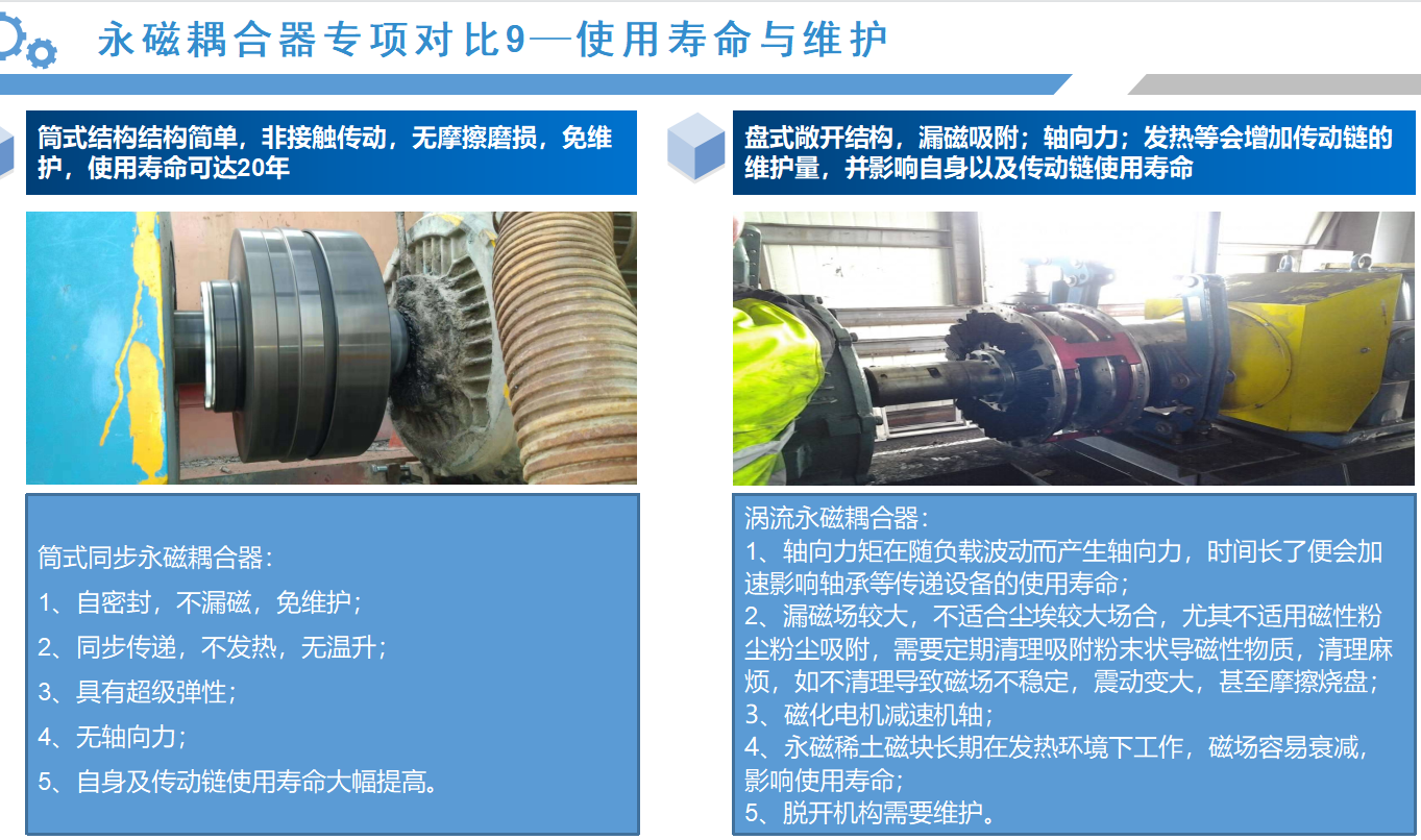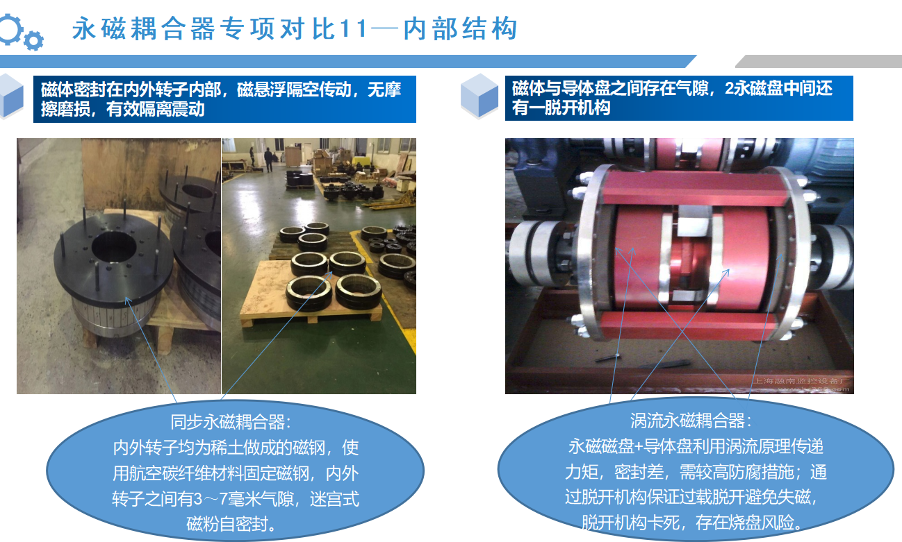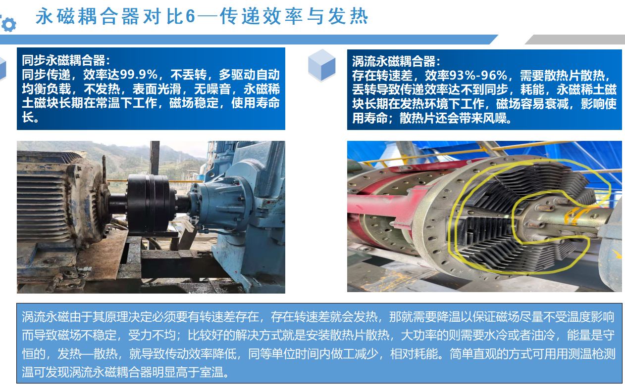 從以上的應(yīng)用案例來(lái)看,同步永磁耦合器的應(yīng)用效果會(huì)比較明顯,接下來(lái),我們通過(guò)數(shù)據(jù)對(duì)比的形式,具體分析筒式同步全永磁耦合器與渦流永磁耦合器優(yōu)劣勢(shì):