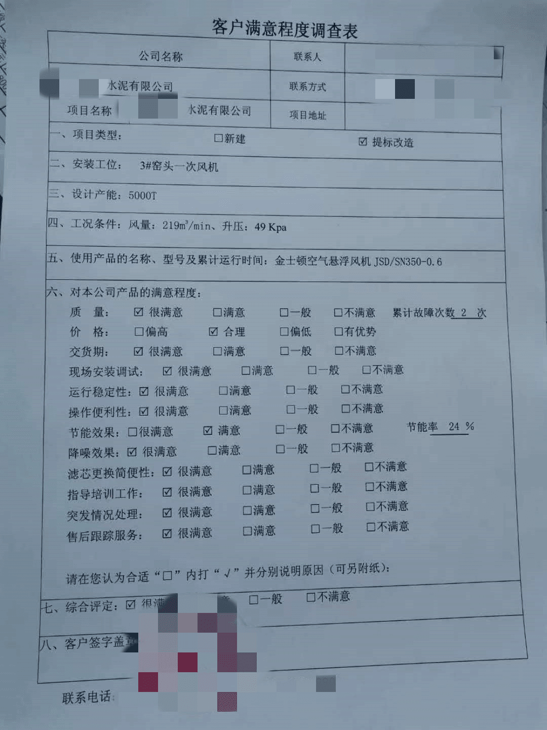 經(jīng)過一段時(shí)間運(yùn)行,水泥廠聯(lián)合金士頓雙方對空氣懸浮風(fēng)機(jī)進(jìn)行檢查驗(yàn)收,發(fā)現(xiàn)窯尾送煤空氣懸浮風(fēng)機(jī)滿足試用考核指標(biāo):平均節(jié)電率為 39.05%,節(jié)能效果明顯,風(fēng)機(jī)運(yùn)行噪音監(jiān)測值最高為77dB,達(dá)到預(yù)期效果(節(jié)電率≥31%,噪音≤80dB)。