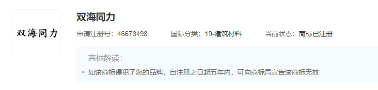 據(jù)查詢“雙海同力”品牌注冊已于2021年2月7日通過,目前在有效期內(nèi)。注冊商標(biāo)申請人為西平縣瑞平水泥粉磨有限公司。