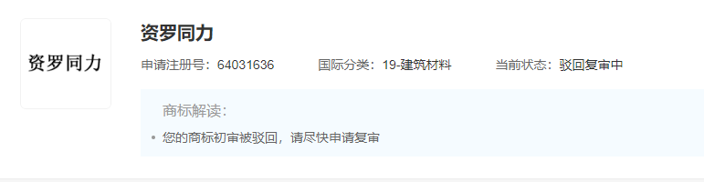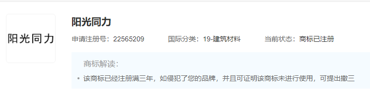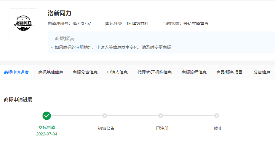 “洛新同力”,商標(biāo)申請人為洛陽畔山水泥有限公司。2023年2月10日商標(biāo)注冊申請被駁回,當(dāng)前狀態(tài)為等待實(shí)質(zhì)審查。