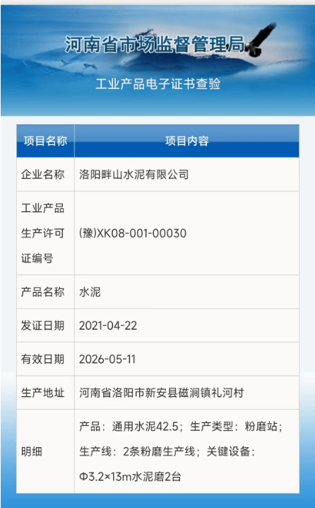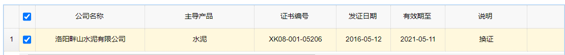 據(jù)查詢,生產(chǎn)許可證編號XK08-001-06236,對應(yīng)生產(chǎn)企業(yè)為洛陽中聯(lián)水泥有限公司,該編號許可證有效期已于2021年1月12日截止。