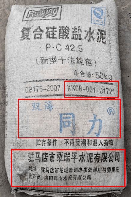 企業(yè)名稱為“駐馬店市覃瑞平水泥有限公司”,地址標(biāo)稱:駐馬店市柏城街道辦事處邵莊村委吳莊,生產(chǎn)商標(biāo)稱為洛陽畔山水泥有限公司 。疑似由洛陽畔山水泥有限公司生產(chǎn)的“雙海同力”水泥。是假冒高仿,還是代加工,就不得而知了。