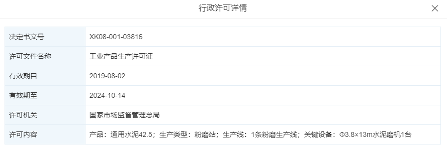 企業(yè)生產(chǎn)許可證編號XK08-001-03816,有效期至2024年10月14日。企業(yè)類型為粉磨站,擁有1條粉磨生產(chǎn)線,關(guān)鍵設(shè)備Φ3.8×13m水泥磨機1臺。