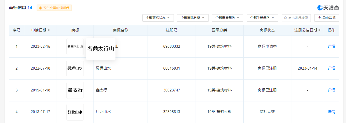 旗下共有14條商標信息,其中2023年2月15日申請的“名鼎太行山”商標目前狀態(tài)為“商標申請”。“金隅太行山”未查到。