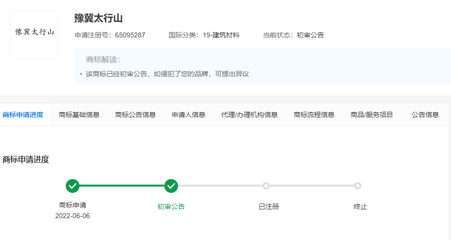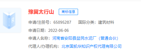 據(jù)市場反饋,來自河南安陽區(qū)域的兩個品牌在邯鄲武安流通市場也有出現(xiàn)。“豫冀太行山”品牌,申請人為河南省安陽縣益民水泥廠,目前狀態(tài)為初審公告階段。