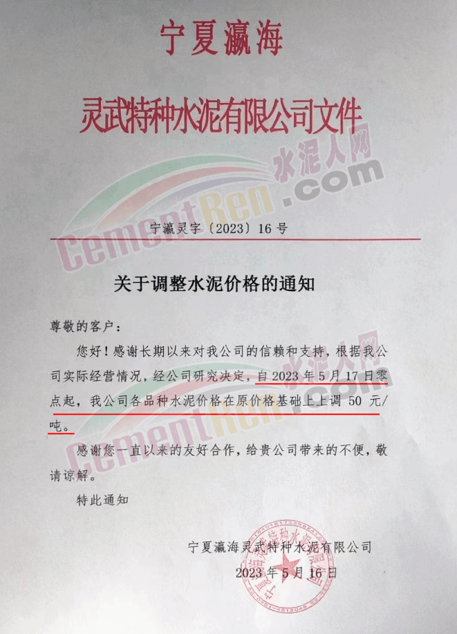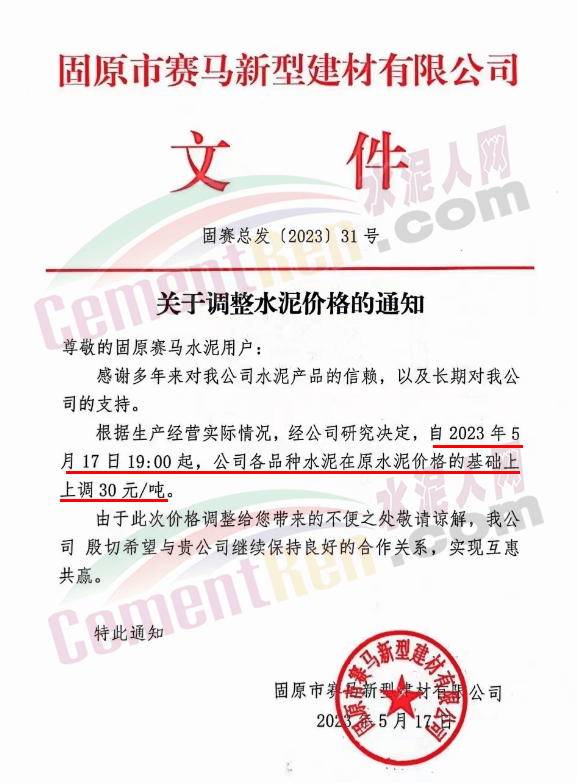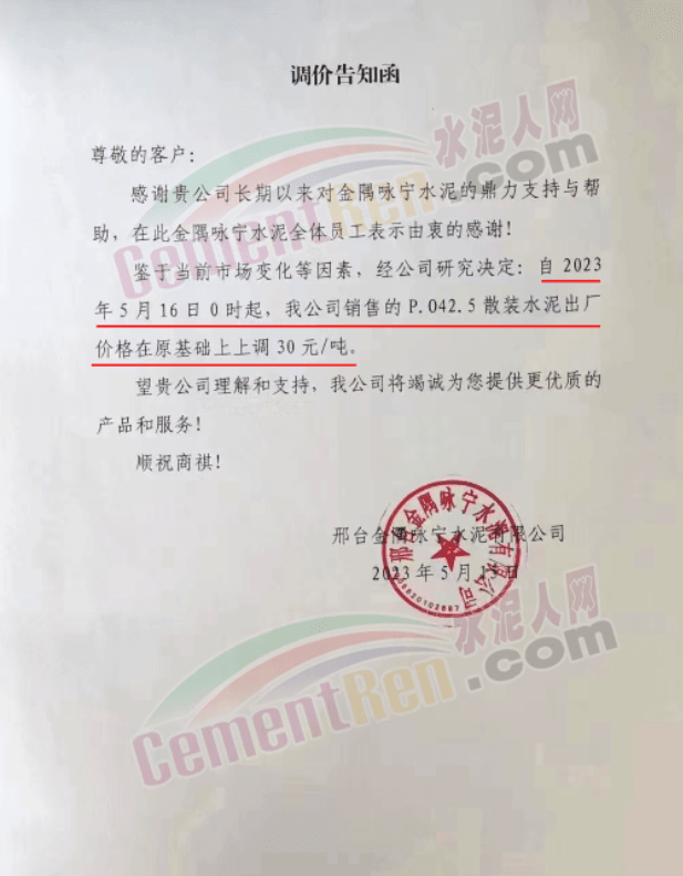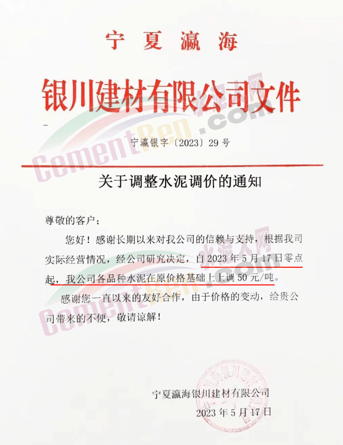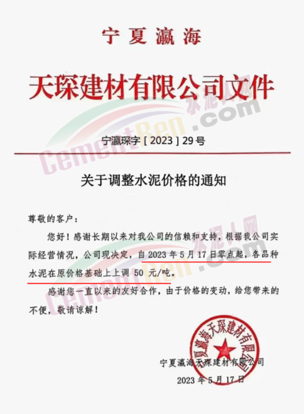 寧夏瀛海天琛建材有限公司通知,根據(jù)公司實(shí)際經(jīng)營(yíng)情況,現(xiàn)決定,自2023年5月17日零點(diǎn)起,各品種水泥在原價(jià)格基礎(chǔ)上上調(diào)50元/噸。