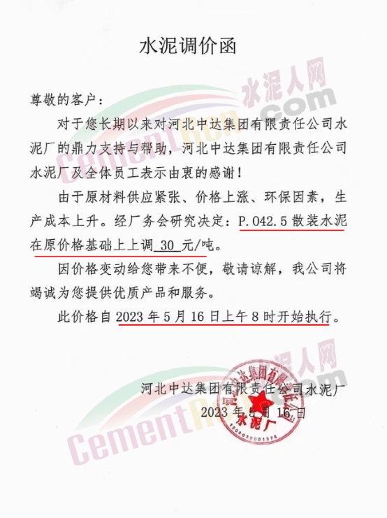 河北中達(dá)集團(tuán)有限責(zé)任公司水泥廠通知,由于原材料供應(yīng)緊張、價(jià)格上漲、環(huán)保因素,生產(chǎn)成本上升,經(jīng)廠務(wù)會(huì)研究決定,自5月16日起P.O42.5散裝水泥上調(diào)30元/噸。