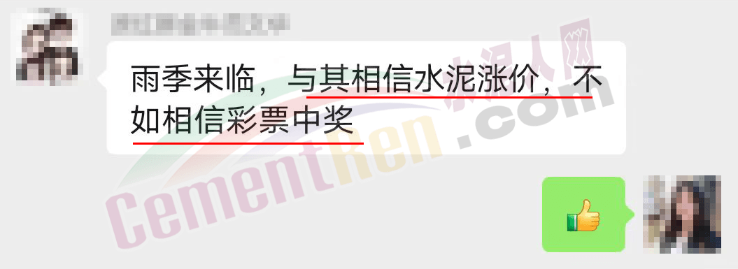對(duì)于水泥企業(yè)復(fù)價(jià)上調(diào),一經(jīng)銷商調(diào)侃稱,雨季來(lái)臨,與其相信水泥漲價(jià),不如相信彩票中獎(jiǎng)。