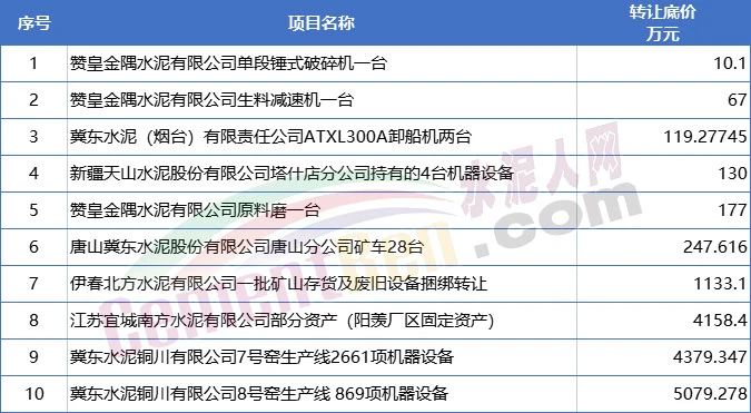 10個正在轉(zhuǎn)讓的項目多為固定資產(chǎn)和設(shè)備機(jī)器轉(zhuǎn)讓。其中冀東水泥銅川有限公司8號窯生產(chǎn)線869項機(jī)器設(shè)備轉(zhuǎn)讓底價超5000萬元。