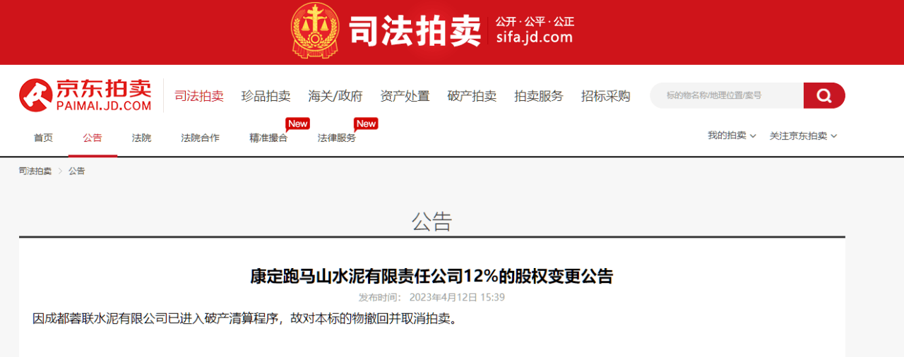 從京東司法拍賣平臺可見,成都蓉聯(lián)水泥有限公司已進(jìn)入破產(chǎn)清算程序,故對本標(biāo)的物撤回并取消拍賣。