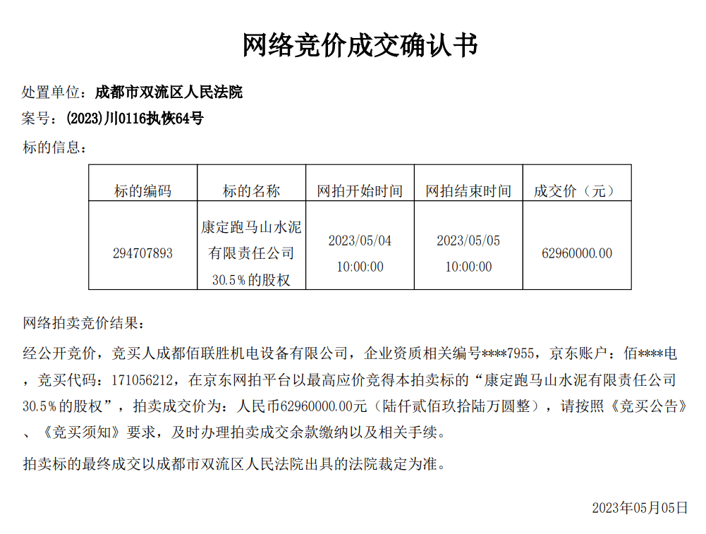 同期,康定跑馬山水泥有限責(zé)任公司30.5%的股權(quán)于5月5日被成功拍出,并未受到成都蓉聯(lián)水泥有限公司破產(chǎn)的影響。成交確認(rèn)書顯示,經(jīng)公開競價,競買人成都佰聯(lián)勝機(jī)電設(shè)備有限公司在京東網(wǎng)拍平臺以最高價競得本拍賣標(biāo)的,拍賣成交價為6296萬元。