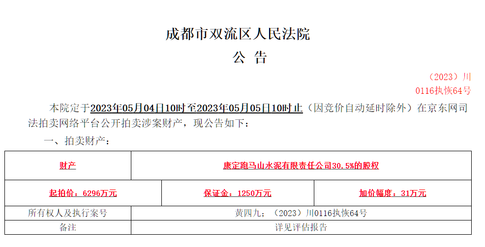3月29日,成都市雙流區(qū)人民法院發(fā)布拍賣公告(川0116執(zhí)恢64號)提到定于5月4日10時至5月5日10時在京東網(wǎng)司法拍賣網(wǎng)絡(luò)平臺公開拍賣涉案財產(chǎn)。拍賣財產(chǎn)為康定跑馬山水泥有限責(zé)任公司12%的股權(quán),起拍價2478萬元。