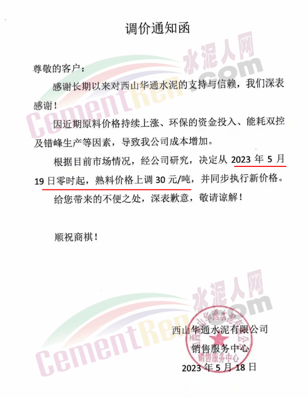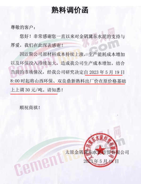 晉中同力達水泥銷售處通知,因近期公司原材料成本持續(xù)上漲,生產能耗成本增加以及環(huán)保投入持續(xù)加大,造成公司生產成本增加。結合當前的市場情況,經公司研究決定自5月19日8時起將熟料出廠價在原價格基礎上上調30元/噸。