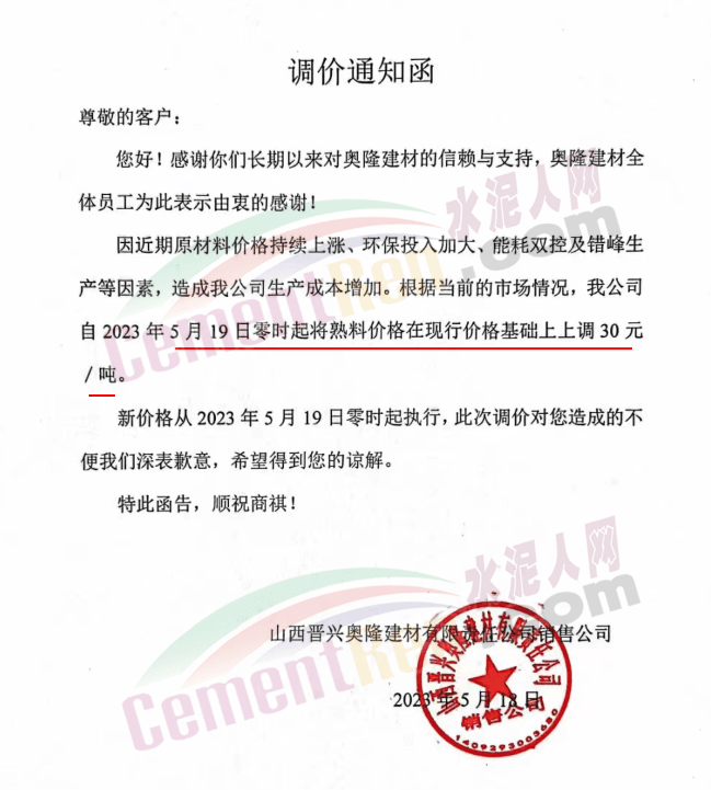 山西晉興奧隆建材有限責任公司銷售公司通知,因近期原材料價格持續(xù)上漲、環(huán)保投入加大、能耗雙控及錯峰生產等因素,造成公司生產成本增加。根據(jù)當前的市場情況,公司自2023年5月19日零時起將熟料價格在現(xiàn)行價格基礎上上調30元/噸。