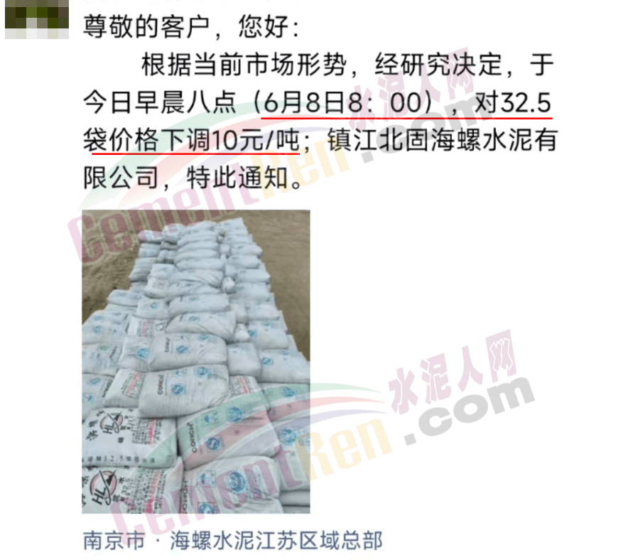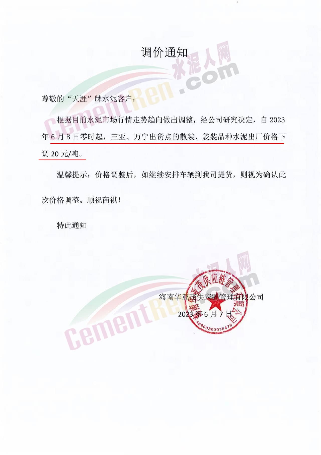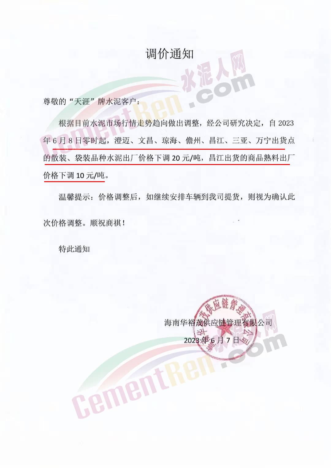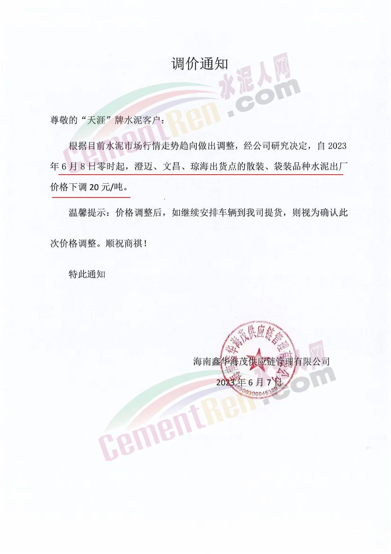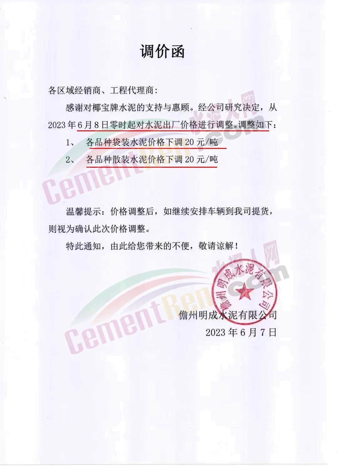 同期儋州明成水泥有限公司發(fā)函通知從2023年6月8日零時(shí)起對(duì)“椰寶”牌水泥出廠價(jià)下調(diào)20元/噸。