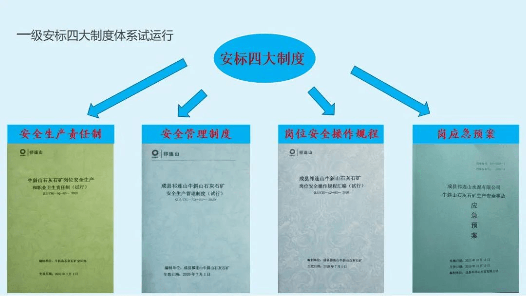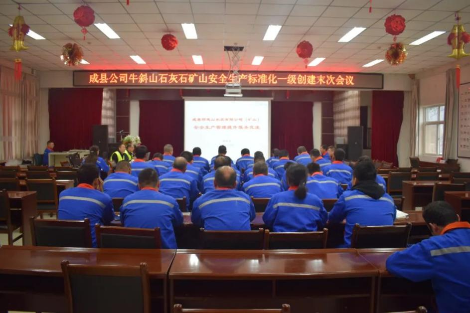 成縣分公司于2014年開展礦山安全生產(chǎn)標準化創(chuàng)建工作,于2016年1月通過二級礦山安全生產(chǎn)標準化并授牌,持續(xù)通過復評授牌。2019年11月啟動礦山一級安全生產(chǎn)標準化創(chuàng)建工作,已完成四大體系文件建設:管理制度80個、安全生產(chǎn)責任制58項、安全操作規(guī)程70項、綜合應急預案一章、專項應急預案7章、現(xiàn)場處置方案9章、已完成備案并持續(xù)運行,崗位達標工作持續(xù)開展。
