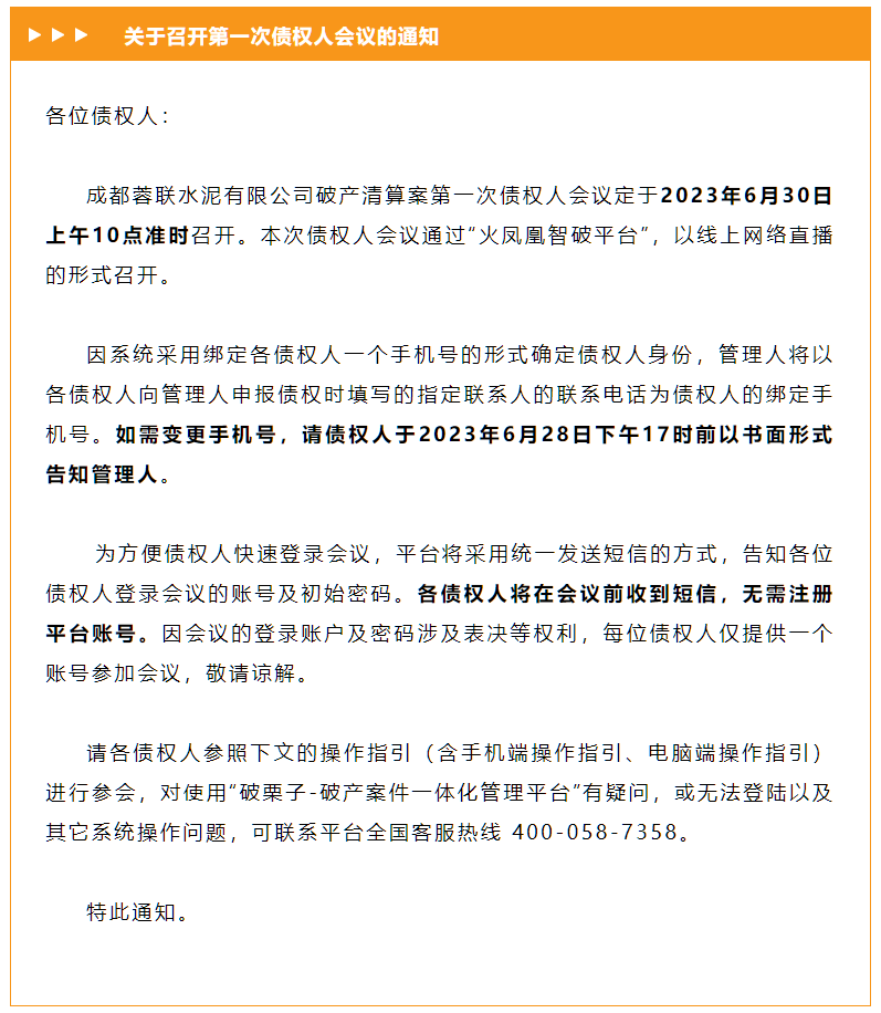 6月21日,雙流法院微發(fā)布微信公眾號(hào)發(fā)布《成都蓉聯(lián)水泥有限公司破產(chǎn)清算案第一次債權(quán)人會(huì)議通知及操作指引》提到,成都蓉聯(lián)水泥有限公司破產(chǎn)清算案第一次債權(quán)人會(huì)議定于2023年6月30日上午10點(diǎn)準(zhǔn)時(shí)召開。