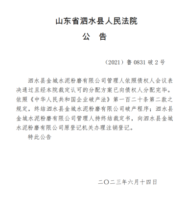 6月14日山東省泗水縣人民法院發(fā)布公告稱,泗水縣金城水泥粉磨有限公司管理人依照債權(quán)人會(huì)議表決通過且經(jīng)本院裁定認(rèn)可的分配方案已向債權(quán)人分配完畢。依照《中華人民共和國(guó)企業(yè)破產(chǎn)法》相關(guān)規(guī)定,終結(jié)泗水縣金城水泥粉磨有限公司破產(chǎn)程序;泗水縣金城水泥粉磨有限公司管理人持終結(jié)裁定書,向泗水縣金城水泥粉磨有限公司原登記機(jī)關(guān)辦理注銷登記。