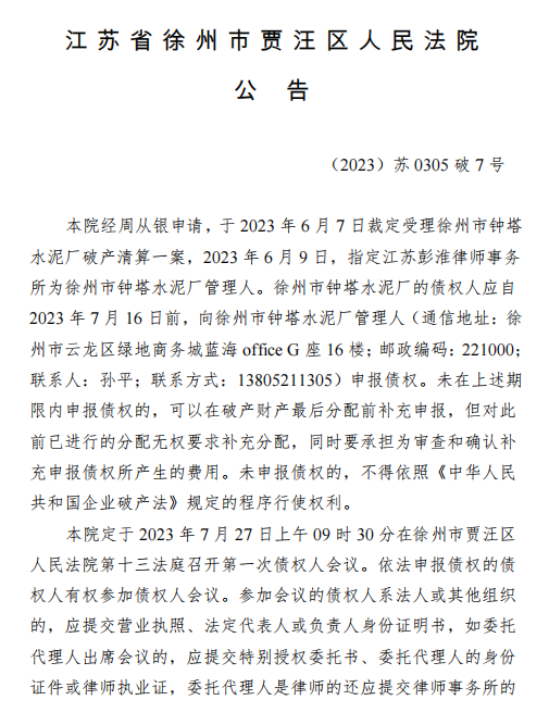 江蘇省徐州市賈汪區(qū)人民法院公告于2023年6月7日裁定受理徐州市鐘塔水泥廠破產(chǎn)清算一案,2023年6月9日,指定江蘇彭淮律師事務(wù)所為徐州市鐘塔水泥廠管理人。