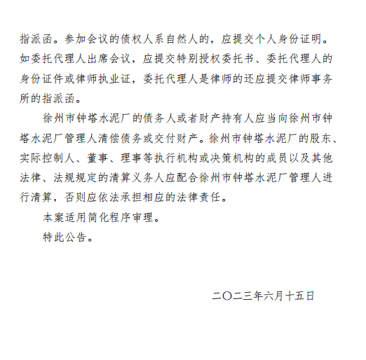 徐州市鐘塔水泥廠破產(chǎn)清算