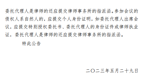 參加會(huì)議的債權(quán)人是法人或其他組織的,應(yīng)當(dāng)提供營(yíng)業(yè)執(zhí)照、法定代表人或負(fù)責(zé)人身份證明書,如委托代理人參加的,還應(yīng)當(dāng)提供特別授權(quán)委托書、委托人身份證或律師執(zhí)業(yè)證,委托代理人是律師的還應(yīng)提交律師事務(wù)所的指派函,并于2023年6月28日上午9點(diǎn)20分登錄破易云平臺(tái)(方式一:手機(jī)微信搜索“破易云”小程序,在登錄頁中輸入手機(jī)號(hào)、獲取短信驗(yàn)證碼并輸入案件識(shí)別碼:111481,登錄參會(huì);方式二:電腦瀏覽器訪問網(wǎng)址https://zqr.poyiyun.com/ 登錄后參與會(huì)議,本案件識(shí)別碼:111481)召開德宏州三象通用水泥有限責(zé)任公司強(qiáng)制清算案第一次債權(quán)人正式會(huì)議,本次會(huì)議開始前管理人將會(huì)議文本上傳至破易云平臺(tái),請(qǐng)債權(quán)人及時(shí)登陸破易云平臺(tái)下載查閱。請(qǐng)各位債權(quán)人準(zhǔn)時(shí)登錄系統(tǒng),點(diǎn)擊進(jìn)入債權(quán)人會(huì)議,通過網(wǎng)絡(luò)方式參與會(huì)議和投票表決。