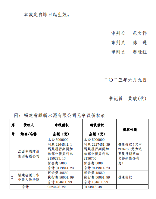 2023年4月13日,福建省龍巖市新羅區(qū)人民法院根據(jù)江西中煤建設(shè)集團(tuán)有限公司的申請(qǐng)裁定受理福建省麒麟水泥有限公司破產(chǎn)清算一案。法院查明,截至2023年5月19日債權(quán)申報(bào)期屆滿,福建省麒麟水泥有限公司管理人共收到2戶債權(quán)人申報(bào)債權(quán),申報(bào)的債權(quán)總額為9524426.22元。