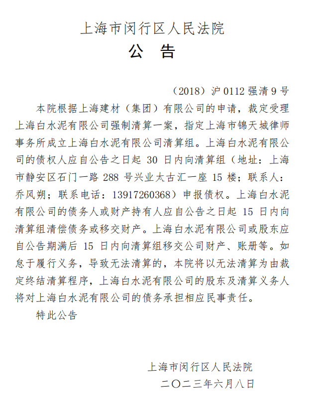 上海市閔行區(qū)人民法院公告,根據(jù)上海建材(集團(tuán))有限公司的申請(qǐng),裁定受理上海白水泥有限公司強(qiáng)制清算一案,指定上海市錦天城律師事務(wù)所成立上海白水泥有限公司清算組。