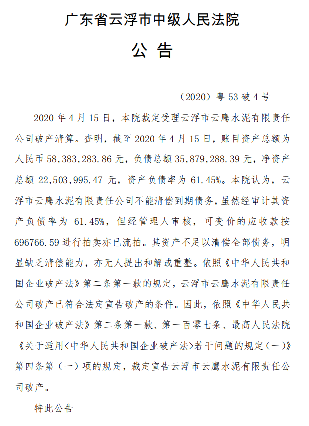 2020年4月15日,廣東省云浮市中級(jí)人民法院裁定受理云浮市云鷹水泥有限責(zé)任公司破產(chǎn)清算,并裁定宣告云浮市云鷹水泥有限責(zé)任公司破產(chǎn)。