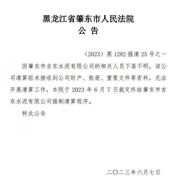 因肇東市吉東水泥有限公司的相關(guān)人員下落不明,清算組未接收到公司財(cái)產(chǎn)、賬冊(cè)、重要文件等資料,無法開展清算工作,黑龍江省肇東市人民法院于2023年6月7日裁定終結(jié)肇東市吉東水泥有限公司強(qiáng)制清算程序。